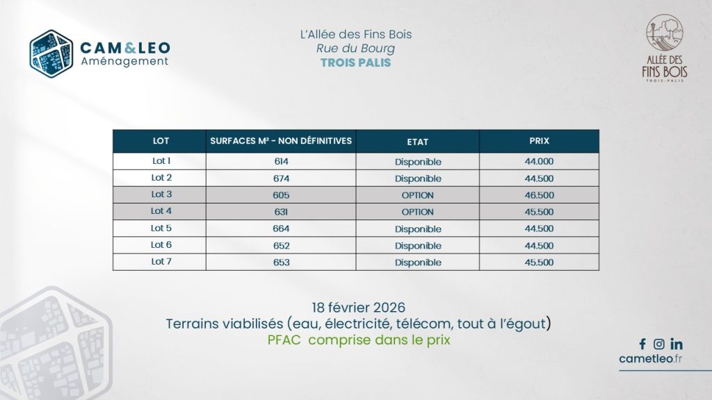 Découvrez notre tout nouveau programme de 7 terrains à bâtir, entièrement viabilisés, idéalement situé sur la commune prisée de Trois-Palis, à seulement quelques minutes d’Angoulême.