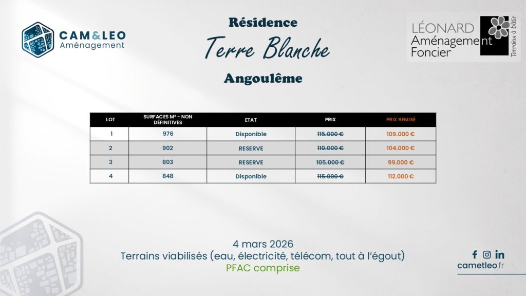Découvrez ce programme unique niché dans un véritable écrin de verdure, proposant 4 grandes parcelles d’environ 800 à 1000 m². Situés au pied du plateau, ces terrains offrent une vue dégagée plein Sud sur la belle ville d’Angoulême, sa cathédrale emblématique, et un environnement apaisant.